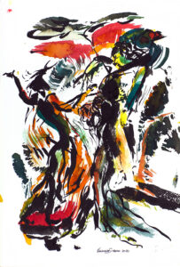Lähtökohtana luonto, erilaiset ihmiset ja elämän vivahteet. Maalasin ensin kallioita ja merta, jossa uin ja jonka yli kuljin kahden mantereen välillä. Alkoi erottua abstrakteja mielikuvia: Outoja hahmoja, musiikkia, tanssia, rituaaleja, lintuja; mies ja korppi, nainen ja käärme, ihmisiä elämän poluilla joskus tarkasti, usein varjoina tai viitteellisinä, arjessa ja myyteissä.